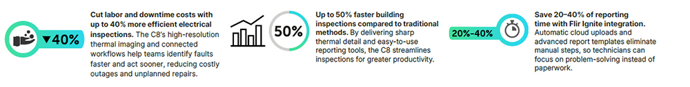 Traditional thermal inspections can be slow, unclear, and hard to document, relying on manual processes and risking missed issues. These inefficiencies lead to higher maintenance costs, delayed repairs, and reduced productivity. The Flir C8 solves these challenges with a rugged, easy-to-use form factor that puts powerful high-resolution thermography into your hands, ensuring accurate, efficient, and standardized inspections anywhere you need them.